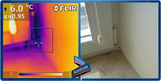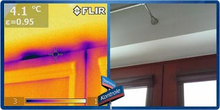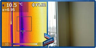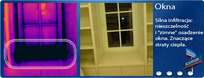 Powyżej widzimy nieprawidłowo osadzone okno. Skutkuje to mostkiem termicznym i wychłodzeniem muru w okolicach ramy okiennej, a w szczególności okolic parapetu. Takie nieprawidłowości przy osadzaniu okna mogą być spowodowane wadliwym wypełnieniem szczelin między oknem a murem (np. brakiem lub ubytkiem materiału izolacyjnego, zwykle pianki montażowej), zastosowaniem niskiej jakości pianki, albo też użyciem letniej pianki przy montażu w niskich temperaturach.