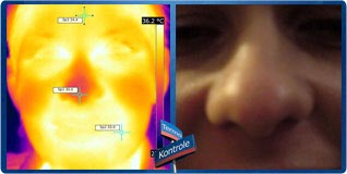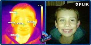 Powyżej: temperatura u zdrowego człowieka nie wszędzie wynosi 36,6°C. U dziecka na zdjęciach powyżej stwierdzono następujące temperatury: policzek - najniższa temperatura 32,0°C, ucho - najwyższa temperatura 36,7°C, czoło średnia temperatura 35,4°C, nos - najniższa temperatura 33,5°C i szyja - najwyższa temperatura 37,3°C.