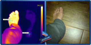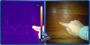 Powyżej: "termiczny napis termo-kontrole" (ślad pozostawiony przez palec o temperaturze ok. 34°C na drewnianej podłodze o średniej temperaturze 21,7°C; ślad po palcu miał przez kilka chwil temperaturę 21,9°C-22°C, a więc niewiele wyższą od temperatury podłogi.