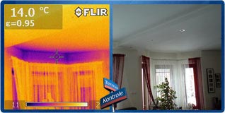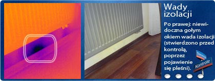 na powierzchni ściany nad listwą podłogową i w konsekwencji powstawania pleśni.Kontrola termowizyjna wskaże miejsca pogorszonej izolacji i zwiększonych strat ciepła. Wskaże mostki termiczne, błędy wykonawcze, luki w ciągłości ocieplenia, ubytki w elewacji. Każda wada izolacji – projektowa, wykonawcza, powykonawcza – zwiększa straty ciepła i koszty ogrzewania.
