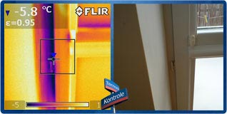 Powyżej widzimy nieprawidłowo osadzone okno. Skutkuje to mostkiem termicznym i wychłodzeniem muru w okolicach ramy okiennej, a w szczególności okolic parapetu. Takie nieprawidłowości przy osadzaniu okna mogą być spowodowane wadliwym wypełnieniem szczelin między oknem a murem (np. brakiem lub ubytkiem materiału izolacyjnego, zwykle pianki montażowej), zastosowaniem niskiej jakości pianki, albo też użyciem letniej pianki przy montażu w niskich temperaturach.