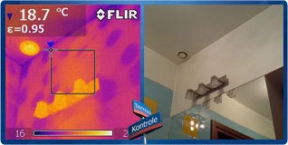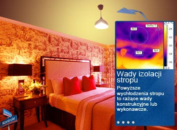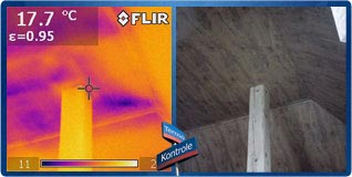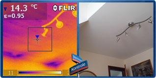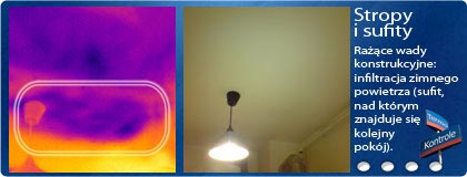 Powyżej: rażące błędy (infiltracja zimnego powietrza, wychładzanie się sufitu i powstawanie wilgoci na suficie, nad którym znajduje się ogrzewane kolejne pomieszczenie). W tym przypadku powyżej, sufit nie jest wyłożony płytami G-K, a więc źródła problemu należy szukać w wadliwej konstrukcji budynku (w tym przypadku jest to dom budowany w technologii kanadyjskiej) lub w wadach powykonawczych (np. niestaranne i nierównomierne wyłożenie izolacji).