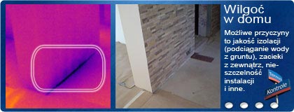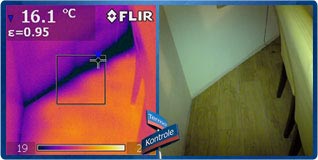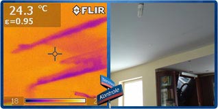 Powyżej: awaria hydrauliczna zimnej wody, widok od dołu na sufit. Rozkład temperatur i kierunek plam wilgoci wskazuje z dużą dokładnością na prawdopodobne miejsce awarii.